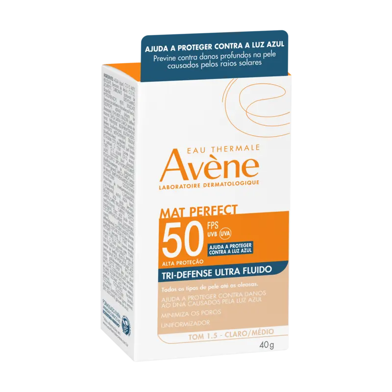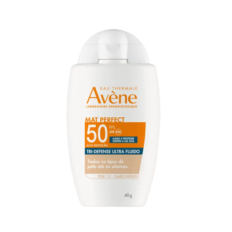 Mat Perfect Tri- Defense Ultra Fluido FPS50 Tom 1.5 é o primeiro protetor solar de muito alta proteção contra raios UVB, UVA curtos e longos até a Luz Azul (450 nm), indicado para todos tipos de pele até as oleosas.